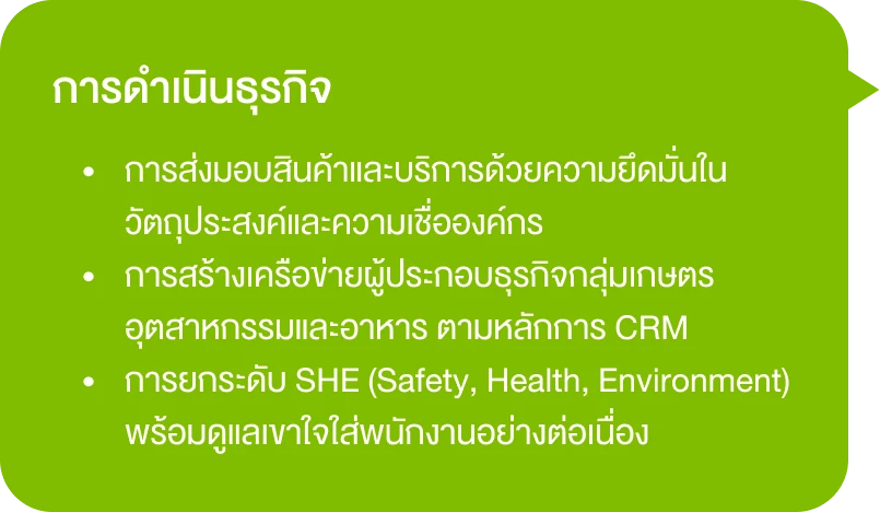 บริษัทฯ และบริษัทย่อยร่วมเสริมสร้าง เครือข่าย และมุ่งยกระดับความร่วมมือ จากหลายภาคส่วน ที่สอดคล้องกับวัตถุ ประสงค์ และความเชื่อองค์กร อันเน้นย้ำ ถึงการช่วยให้ผู้มีส่วนได้เสียทุกคน มี คุณภาพชีวิตที่ดีขึ้นด้วยการนำอาหาร ที่มีคุณภาพมากขึ้น ปลอดภัยมากขึ้น ในราคาที่เป็นธรรม มาประยุกต์ใช้ในการ ดำเนินธุรกิจ โดยสร้างความร่วมมือจาก ทั้งเครือข่ายชุมชน หน่วยงานภาครัฐ สถาบันการศึกษา องค์กร เอกชน เพื่อ ขับเคลื่อนเป้าหมายการพัฒนาที่ยั่งยืน